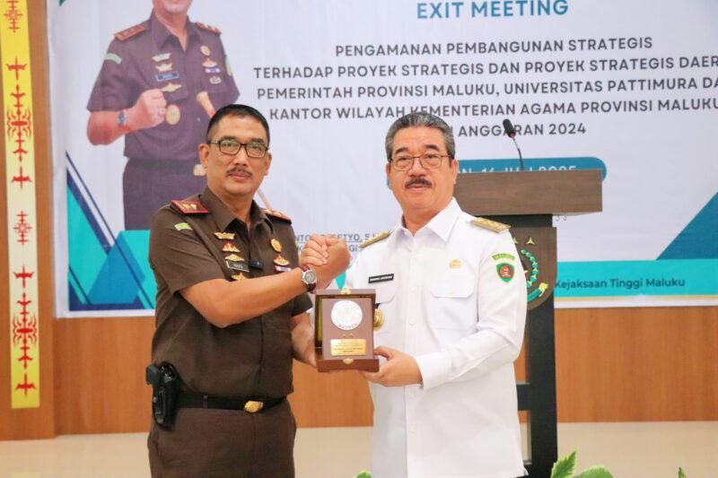 Ambon, PT- Kepala Kejaksaan Tinggi Maluku Agoes Soenanto Prasetyo, S.H.,M.H bersama jajarannya di Aula Sasana Adhyaksa Kejaksaan Tinggi Maluku, menyelenggarakan Exit Meeting bersama Pemerintah Provinsi Maluku yang dihadiri oleh Gubernur Maluku Hendrik Lewerissa, S.H.,LL.M, pada hari ini Rabu (16/07/2025)