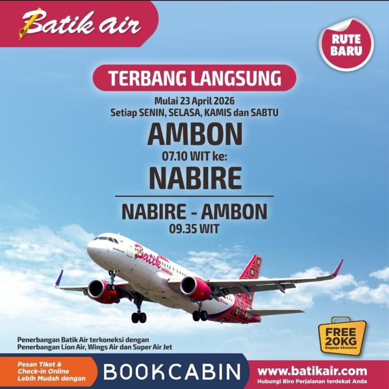 Mulai tanggal 23 April 2026, rute penerbangan langsung (terbang langsung) yang menghubungkan Ambon (AMQ) dengan Nabire (NBX) di Provinsi Papua Tengah akan mulai beroperasi guna memenuhi kebutuhan mobilitas masyarakat yang terus meningkat.
