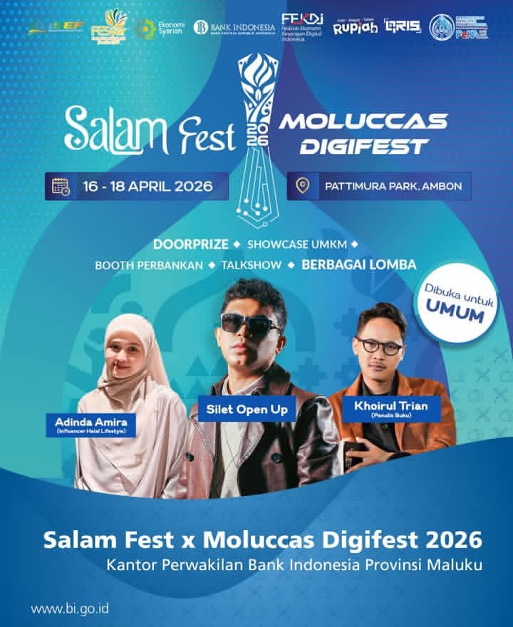 AMBON, PT – Kantor Perwakilan Bank Indonesia Provinsi Maluku akan menggelar Salam Fest x Moluccas Digifest 2026 pada 16–18 April 2026 di Pattimura Park. Kegiatan ini terbuka untuk umum dan menghadirkan berbagai program menarik yang memadukan edukasi ekonomi digital dengan hiburan.